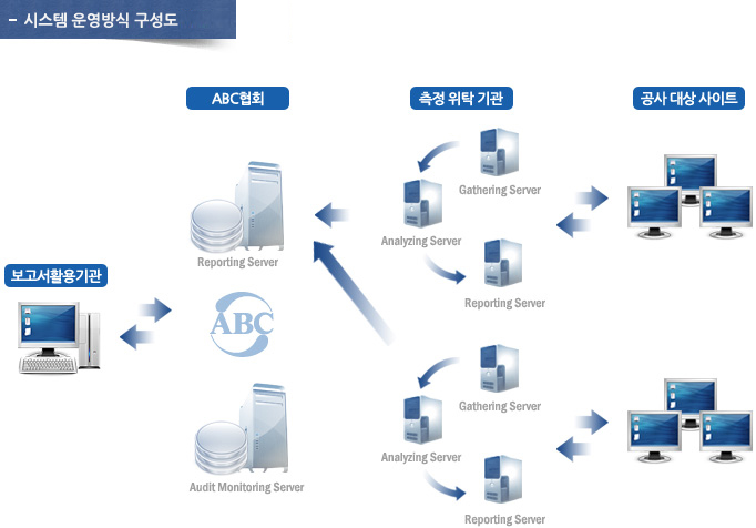 측정전문기관을 선정하여, 공사를 위한 수집, 분석, 보고에 대한 공통의 양식을 제공하고, 선정된 측정전문기관에서는 배정된 사이트에 대하여 스크립트를 설치하여 공사를 위한 데이터를 수집, 분석, 보고의 처리를 진행하며, 한국ABC협회에는 관련된 측정 보고서만을 취합하여 발행하는 방식으로 운영합니다.